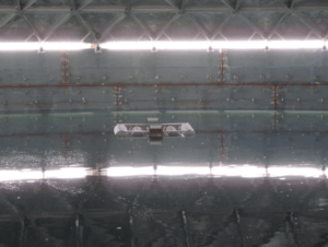 During the initial fill the internal floating roof should be checked to confirm that it travels freely to its full height. The high flotation level shall be evaluated for clearance and the floating suction (if existing) shall be compensated for the excess buoyancy that will be encountered during hydrostatic testing of the floating roof system. During the first event of lowering the level from full height, particular attention shall be given to the floating suction to ensure proper operation.